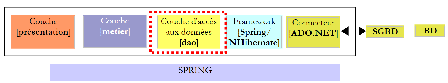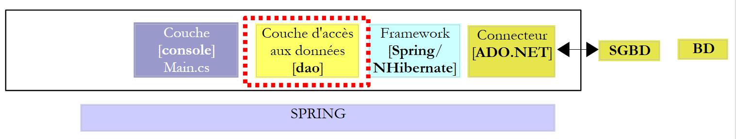 In the following sections, we will build the [DAO] layer with [Spring/NHibernate] by commenting on the code of a working solution. We will not attempt to cover all configuration options or uses of the [Spring/NHibernate] framework. Readers can adapt the proposed solution to their own needs using the Spring.NET documentation [http://www.springframework.net/documentation.html] (June 2010).