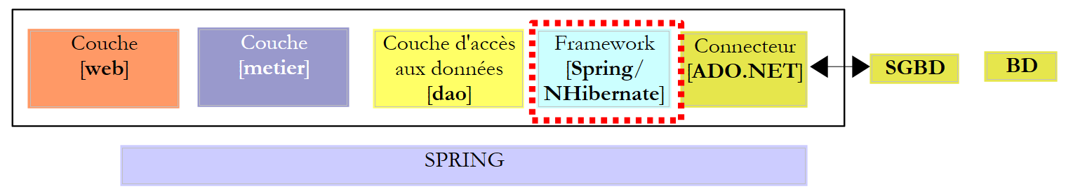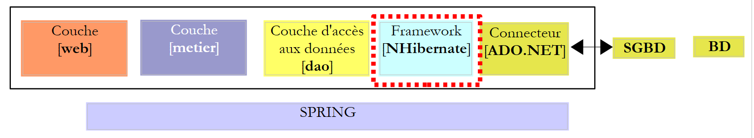 Due to the layered structure used, implementing Spring/NHibernate integration requires modifying only the [DAO] layer. The [Presentation] (web/ASP.NET) and [Business] layers will not need to be modified. This is the main advantage of layered architectures integrated with Spring.