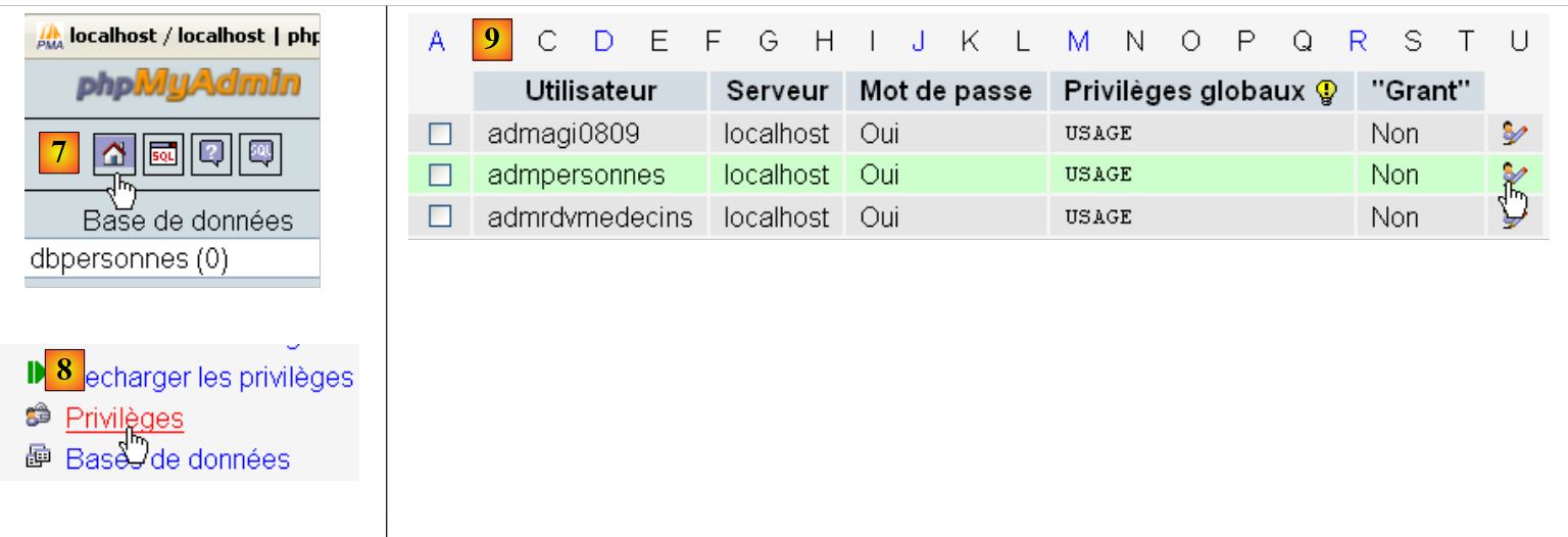 - in [8], use the [Privileges] link on this page to modify the privileges for the user [admpersonnes] [9].