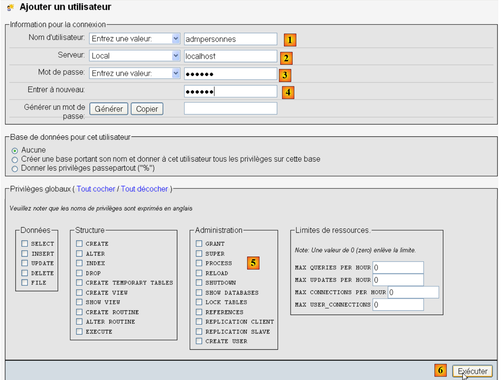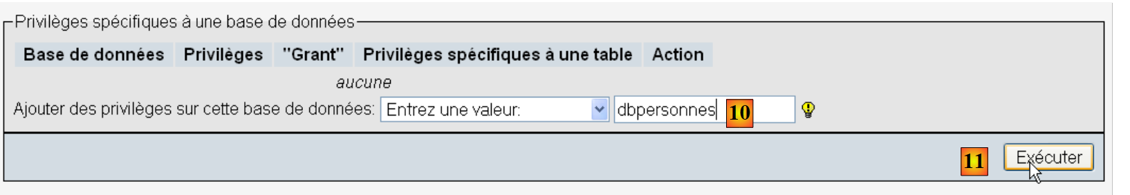 - using the [12] [Select All] link, grant the user [admpersonnes] all rights to the [dbpersonnes] database [13]