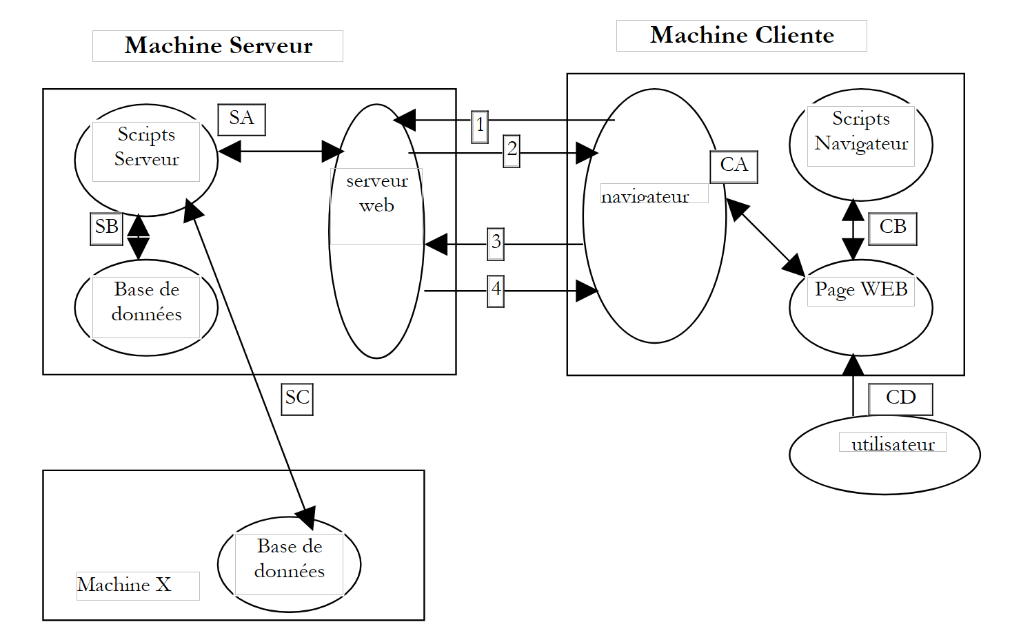 The web server sends the web page for that URL. It may be static or dynamically generated by a server-side script (SA) that may have used content from databases (SB, SC). Here, the script will detect that the URL was requested without any parameters and will generate the initial web page. The browser receives the page and displays it (CA). Browser-side scripts (CB) may have modified the initial page sent by the server. Then, through interactions between the user (CD) and the scripts (CB), the web page will be modified. In particular, forms will be filled out. | |