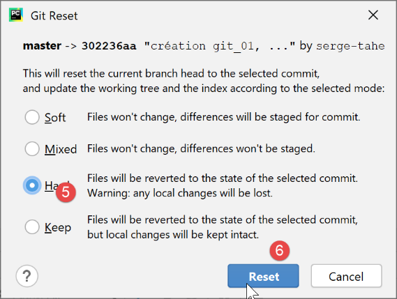 - in [3-5], there are several reset modes. We choose the [hard] mode, which reverts to the selected state while discarding the changes made since then;