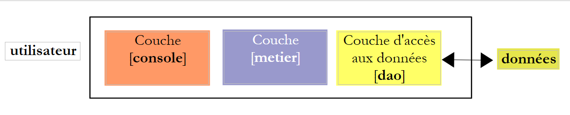 In what follows, the [DAO] and [business] layers will each be implemented using a class. The [console] layer will be implemented by the main program.