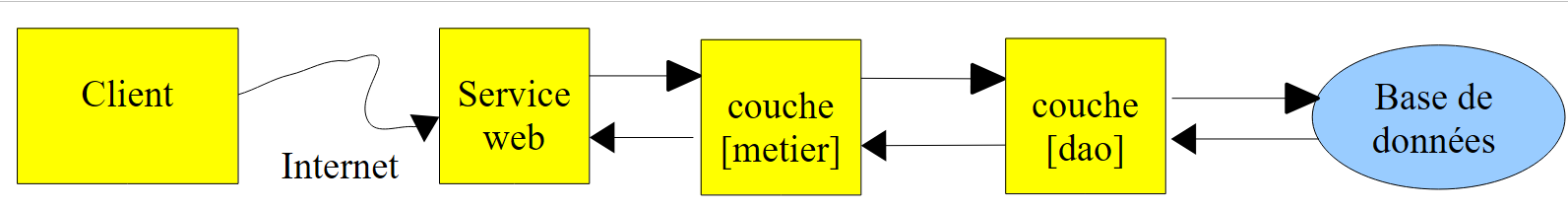 On the server side, we will again use a three-tier architecture. The [DAO] layer will be implemented by the ImpotsMySQL class used in the version with the MySQL DBMS in section 10. The [business] layer will be implemented by the [ImpotsMetier] class already studied. All that remains is to write the web service. This service receives a params parameter from its clients in the form params= yes,2,200000, where the first element indicates whether the taxpayer is married or not, the second their number of children, and the third their annual salary.