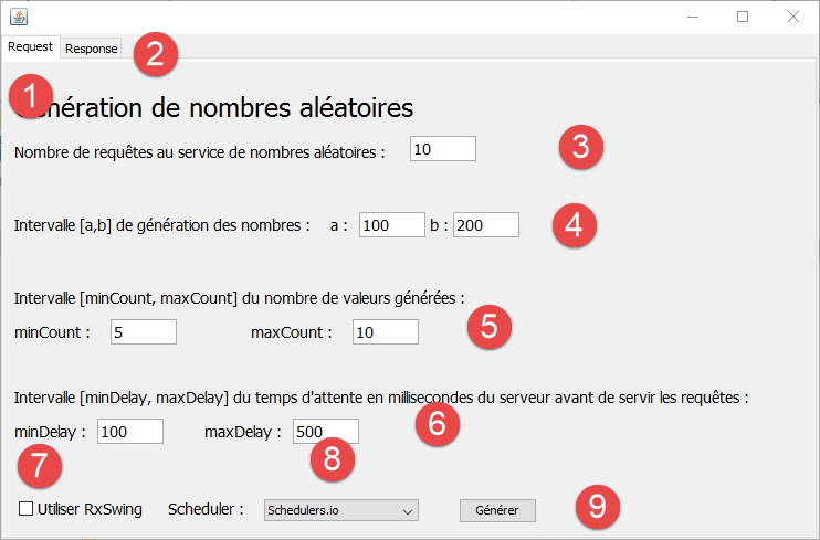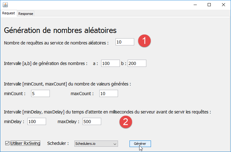 - The interface has two tabs [1-2]: one [Request] for sending a request to the random number generator service, and the other [Response] for displaying the received numbers;