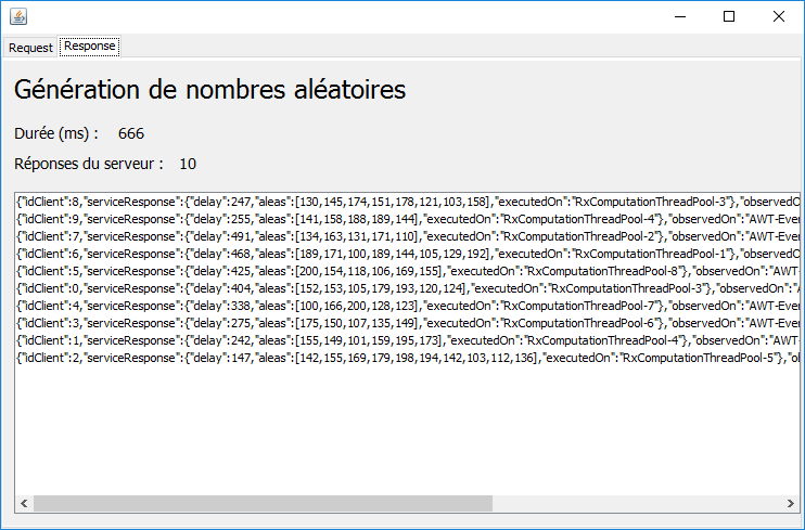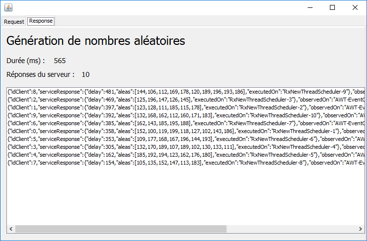 - Line 10: The [observeOn] operator allows us to specify on which thread we want to retrieve the data from the observable, in this case the [nbRequests] objects of type [UiResponse]. In a Swing interface, we have no choice. Any update to the interface must be performed in the event loop thread. Here, the observable’s data will be displayed in a Swing JList component. The [SwingScheduler.getInstance()] thread represents the event loop thread. The [SwingScheduler] class does not come from the RxJava library but from the RxSwing library;
