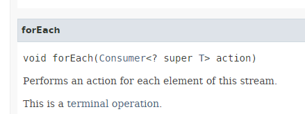 We see that the method’s parameter is the functional interface [Consumer<T>] presented in Section 4.4—an interface whose sole method operates on type T and returns nothing.