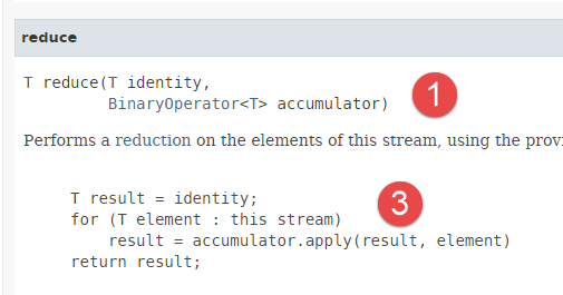- the [reduce] method applies the same processing to all elements in a stream: the initial value of an accumulator is provided as the first parameter. A method implementing the functional interface [BinaryOperator] [2] is provided as the second parameter: based on each element and the accumulator, this method returns a new value for the accumulator. The final value of the accumulator is the value returned by the [reduce] method. The code [3] illustrates this mechanism. The [apply] method is the method of the functional interface [BinaryOperator] [2];