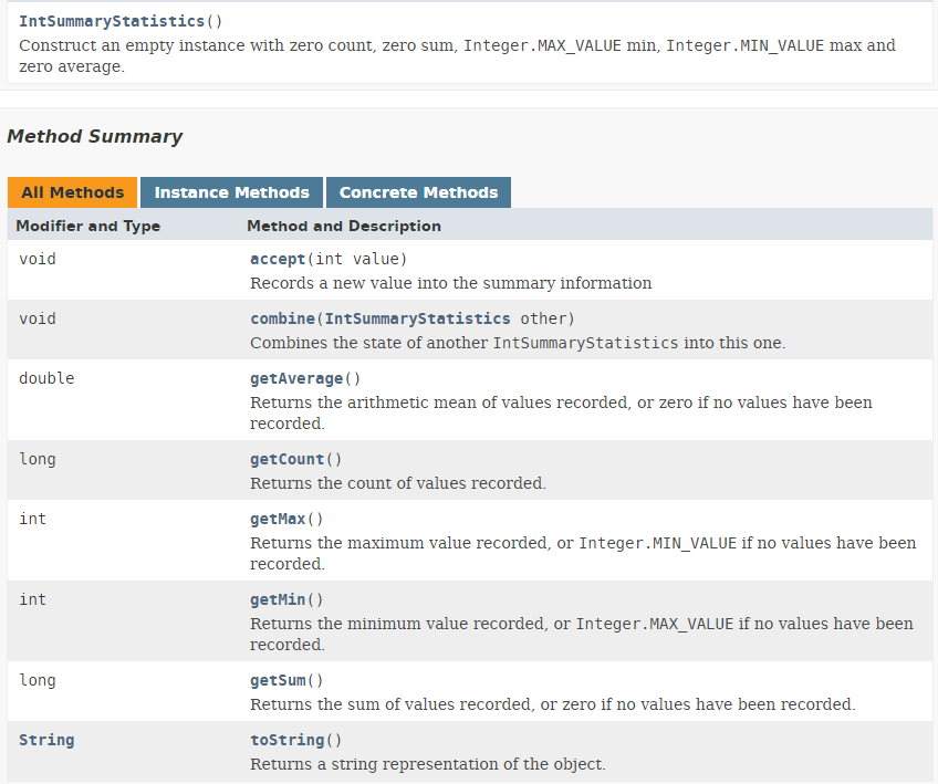 - The result of line 8 of the code is an IntSummaryStatistics type defined as follows: