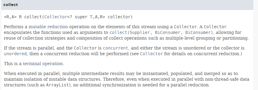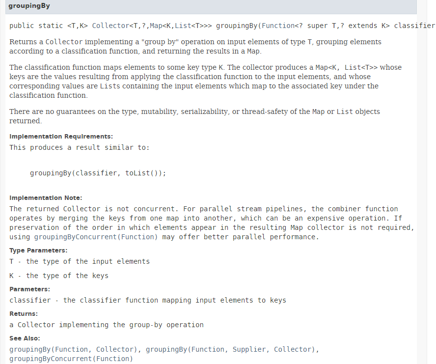 The [collect] method was introduced in Section 5.6.3. Its parameter is an implementation of the [Collector] interface. The [Collectors] class provides a number of static methods that implement the [Collector] interface. So far, we have used the [Collectors.toList()] method. Here, we use the static [Collectors.groupingBy] method, which creates a dictionary from the Stream. Its signature is as follows:
