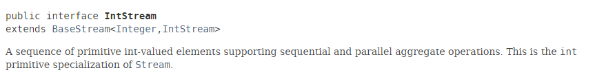 IntStream is a stream of int. This type is preferable to the Stream<Integer> type because its processing avoids boxing/unboxing between the Integer and int types. This interface inherits many methods from the Stream<T> type and adds others, including the [sum] method above, which sums the elements of the IntStream.