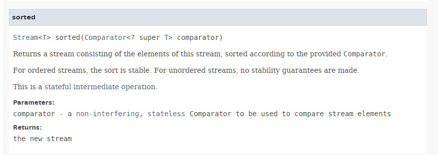 The [sorted] method takes as a parameter the [Comparator] type described in Section 5.6.6 for the min and max methods. It allows a Stream to be sorted in the order of the comparator passed to it as a parameter. We have seen that the [Comparator] interface provides several default static methods that implement common comparators, notably for numbers and strings. Here, we use the [Comparator.comparingInt] method, which takes as a parameter a type ToIntFunction, which is a functional interface for the [applyAsInt] method with the following signature: int applyAsInt(T t). Here, the actual parameter passed to the [Comparator.comparingInt] method on line 3 is the reference to the [Person.age] method, which returns the person’s age.