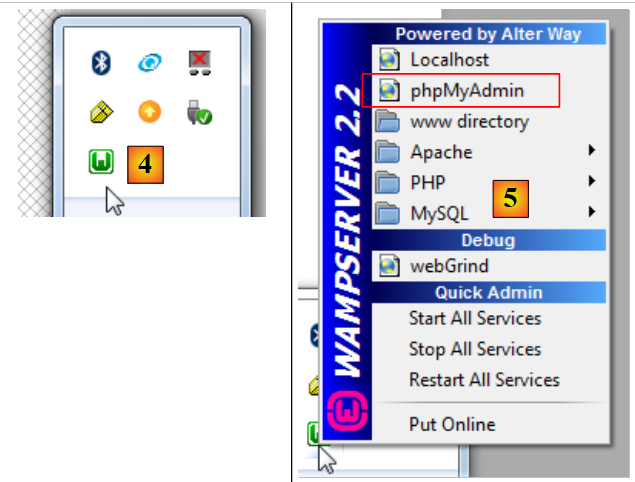 - in [4], the [WampServer] icon appears in the taskbar at the bottom right of the screen [4],