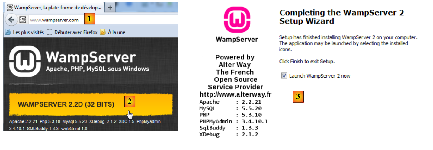 - On the [WampServer] website [1], choose the appropriate version [2],