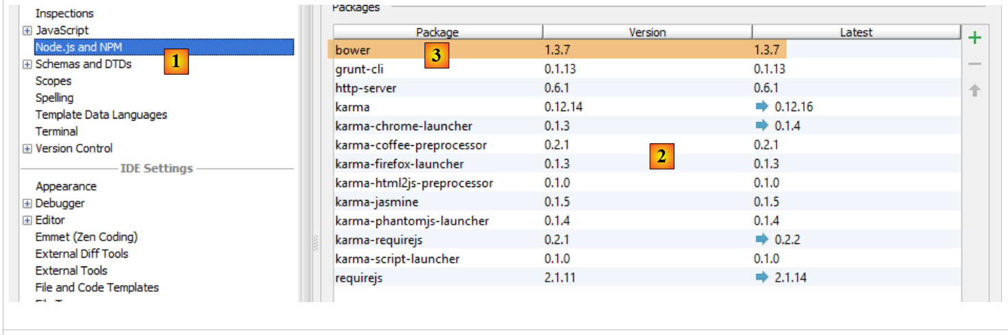 Above, select option [1]. The list of already installed [node.js] modules appears in [2]. This list should only contain line [3] for the [bower] module if you followed the previous installation process.