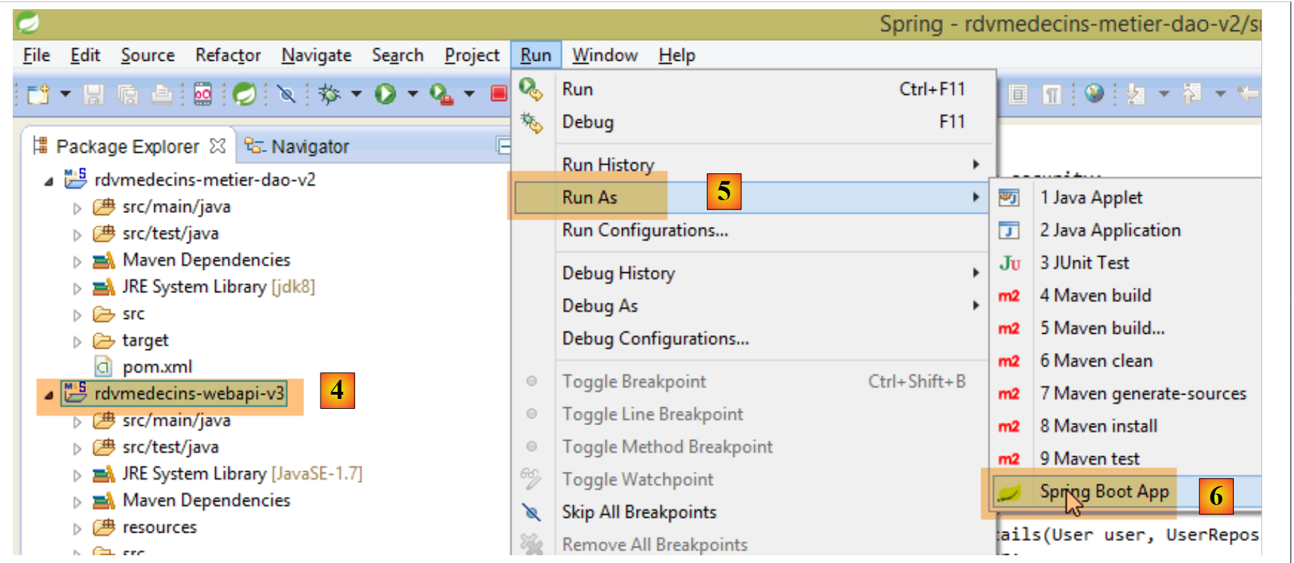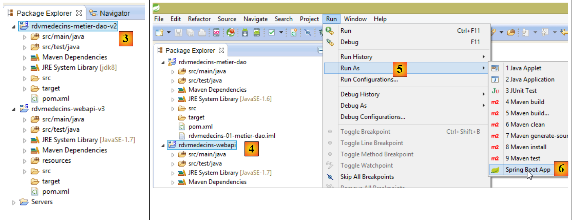 - In [4], [5], and [6], we run the [rdvmedecins-webapi-v3] project as a Spring Boot application;