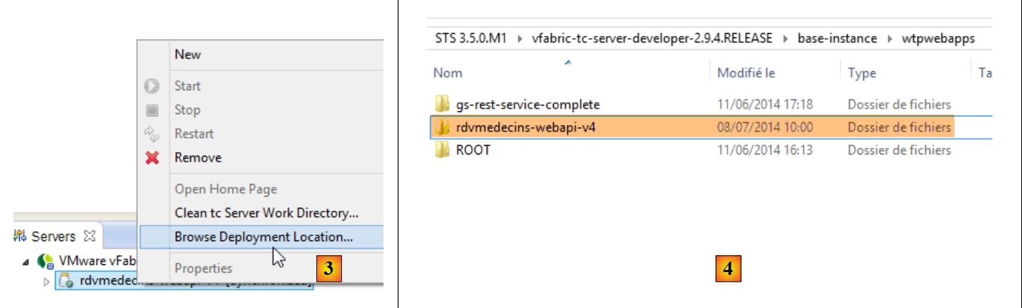 - In the [Servers] tab, right-click on the [rdvmedecins-webapi-v4] application and select the [Browse Deployment Location] option;