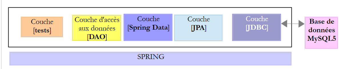 Spring Data is a branch of Spring focused on data access, whether the data is stored in a relational DBMS, a NoSQL database, or other types of storage. Here, we are only concerned with RDBMS and accessing them via JPA. Later on, we will sometimes write [Spring JPA] to actually refer to [Spring Data JPA]. In the architecture above, the [Spring Data] layer provides the [DAO] layer with tools to manage JPA entities.