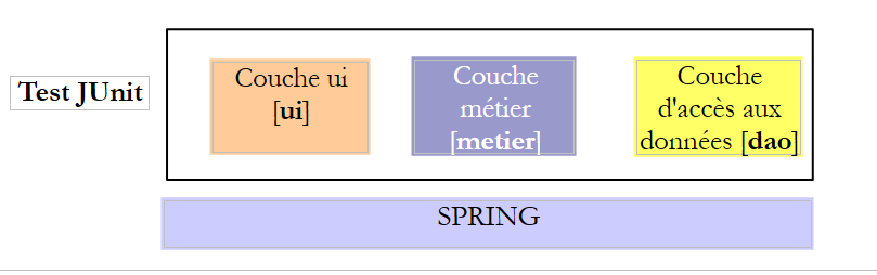 Here, all tests passed. What does this example demonstrate? It demonstrates the flexibility provided by the Spring framework in configuring a layered architecture. You can choose to use the [Ui1, Metier1, Dao1] or [Ui2, Metier2, Dao2] implementation simply by configuring it. Thus, in the previous JUnit test, if you keep only the injection of the [ui1, metier1, dao1] beans, you are working with the first architecture. To change the architecture, simply change the injected beans. This is done without modifying the code of the layers implementing the interfaces. This type of programming is called interface-based programming because we do not use the instances of the classes implementing the layers, but rather the instances of their interfaces.