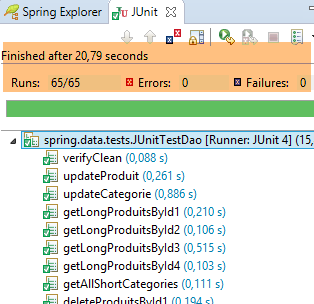 In [1], the [JUnitTestPushTheLimits] test with the Spring Data JPA Hibernate implementation, and in [2], with the Spring JDBC implementation. We can see that the latter performs better. We therefore reach an initial conclusion: it is significantly easier to develop a [DAO] layer with Spring Data JPA, but it is less performant than a Spring JDBC implementation.