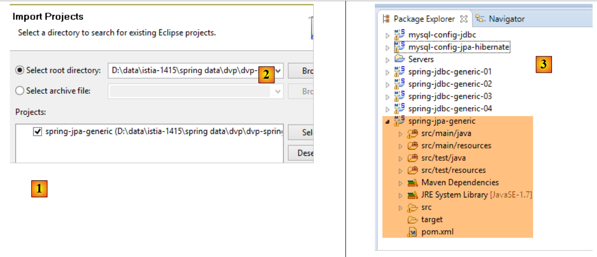 Using STS, import the [mysql-config-jpa-hibernate] project [1] located in the [<examples>/spring-database-config/mysql/eclipse] folder [2]:
