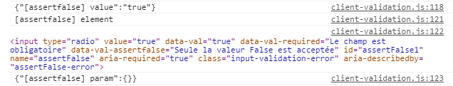 - line 17: if client-side validation is disabled, we clear the error messages from the [client] column of the view. Let’s examine the HTML code of an erroneous element in the Chrome developer console: