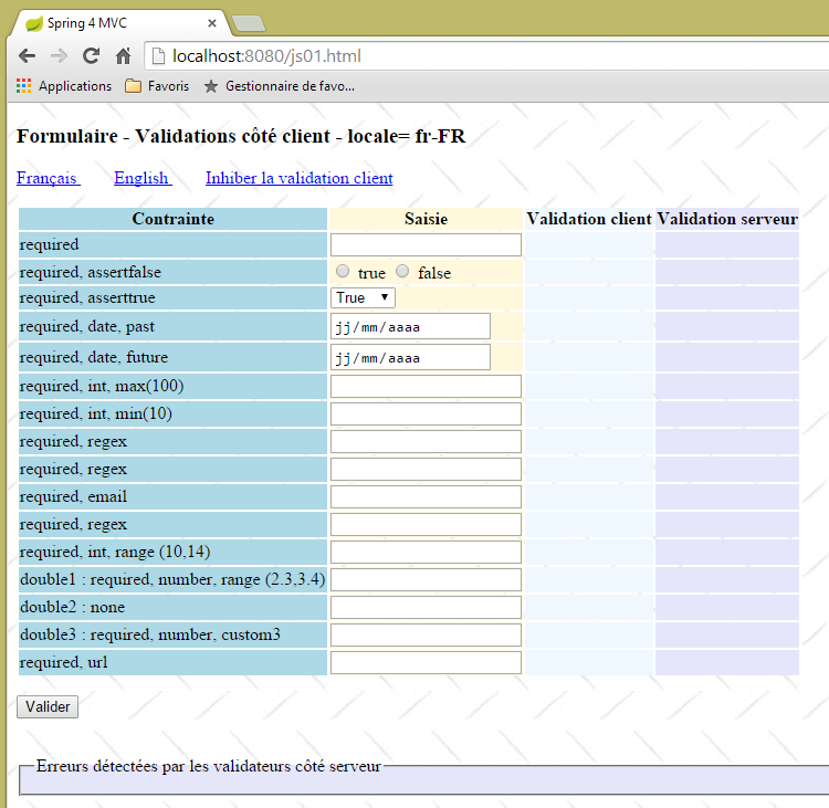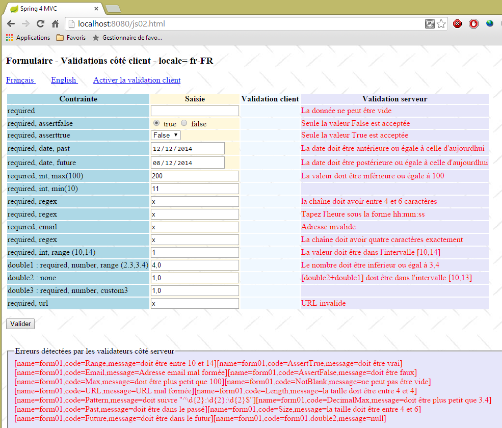 Validations have been implemented on both sides: client and server. Since the POST request only occurs if the values have been deemed valid on the client side, server-side validations always succeed. We have therefore provided a link to disable client-side validations. When in this mode, the behavior is the same as what we have already studied. Here is an example: