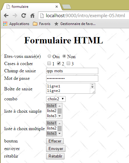 attributes | name="cmbValeurs": control name. size="1": number of visible list items. size="1" makes the list equivalent to a combo box. selected="selected": if this keyword is present for a list item, that item appears selected in the list. In our example above, the list item choice2 appears as the selected item in the combo box when it is first displayed. value=”v”: if the item is selected by the user, this value [v] is posted to the server. If this attribute is absent, the displayed and selected text is posted to the server. |