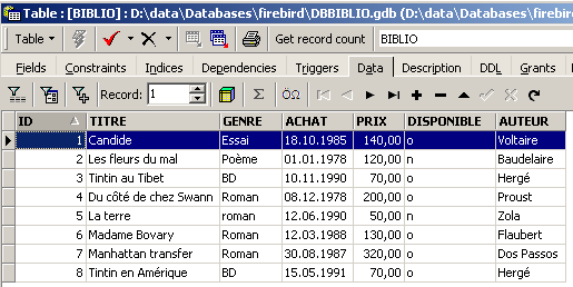 We can verify in the database explorer that the [BIBLIO2] table has been created and that it has the expected structure and content: