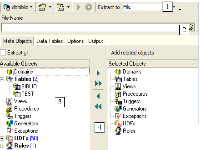 If we wanted to export the entire database, we would check the [Extract All] option above. We simply want to export the BIBLIO table. To do this, using [4], we select the [BIBLIO] table, and using [2], we specify a file: