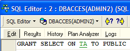A privilege can be granted to everyone using the syntax: GRANT privilege(s) ON table / view TO PUBLIC. Let’s grant the SELECT privilege on the TA table to everyone. We can use either ADMIN1 or ADMIN2 to do this. We’ll use ADMIN2: