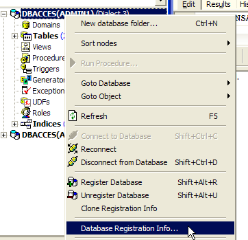 IB-Expert allows you to set the isolation mode in another way. Right-click on the DBACCES(ADMIN1) connection to select the [Database Registration Info] option: