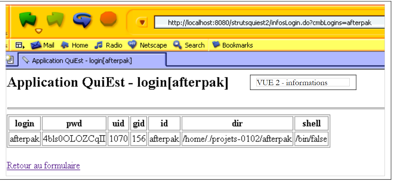 - ForwardAction, which handles the [Back to form] link in the infos.jsp and erreurs.jsp views