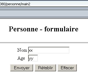 In the resulting form, the [Reset] and [Clear] buttons work. The [Submit] button redirects to the URL /strutspersonne/main.do. According to the application’s web.xml file, the Struts controller will handle this. According to the struts-config.html file, the controller must redirect the request to the view /vues/main.html. Let’s try it: