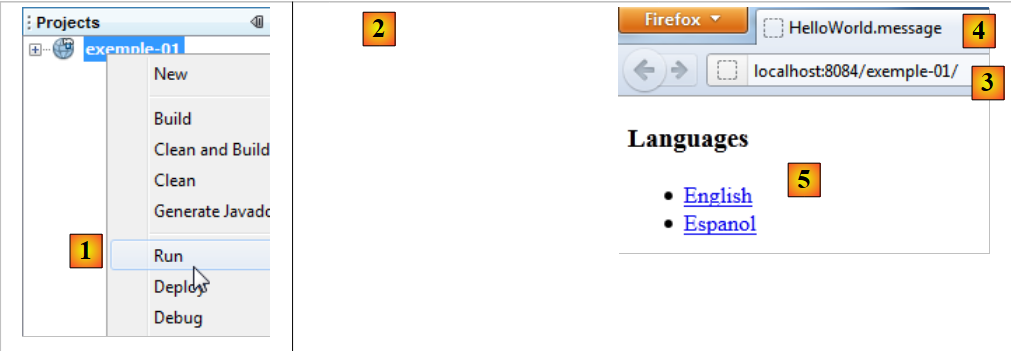 Line 2 indicates that the web application context is /example-01. All URLs of the type [http://machine:port/exemple-01/...] will be handled by this application. This context can be found in the project properties [2]: right-click on the project / Properties / Run.