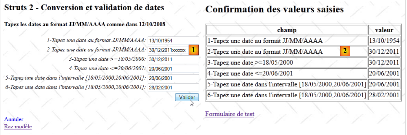 Once the [FormDateModel-validation.xml] file is processed by the validation interceptor, the latter executes the validate method of the [FormDate] action if it exists. We will present it along with the entire action.