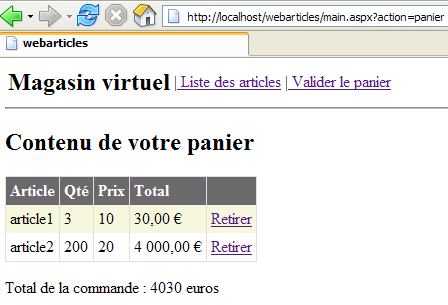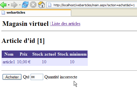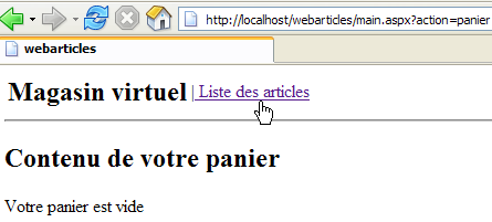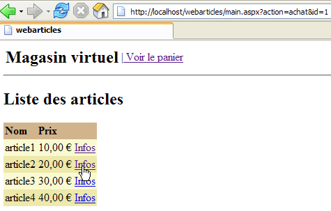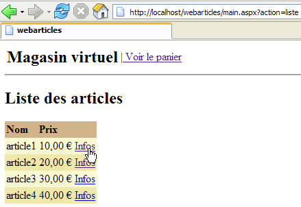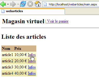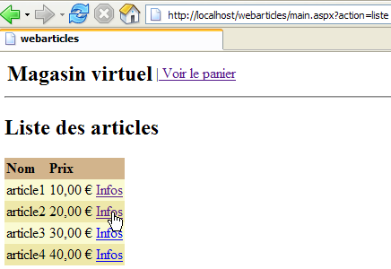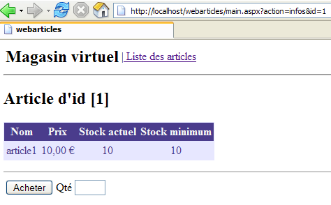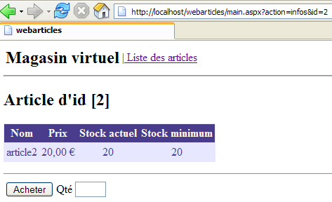 We are ready for testing. The [Cassini] web server retains its usual configuration. We initialize the articles table from the ACCESS source as follows: