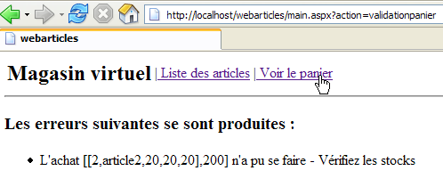 - In [changerStockArticle], there is another operation of type [update]. This involves decrementing stock by an amount greater than the current stock. To do this, the [changerStockArticle] method is used, which returns the number of modified rows as 0 or 1. The SQL command was written to prevent an update (see the "changerStockArticle" SQL command in articles.xml) that would result in a negative stock level. Here, we expect to get 0 as the result of the [changerStockArticle] method. Again, we get an exception of type [IBatisNet.Common.Exceptions.ConcurrentException].