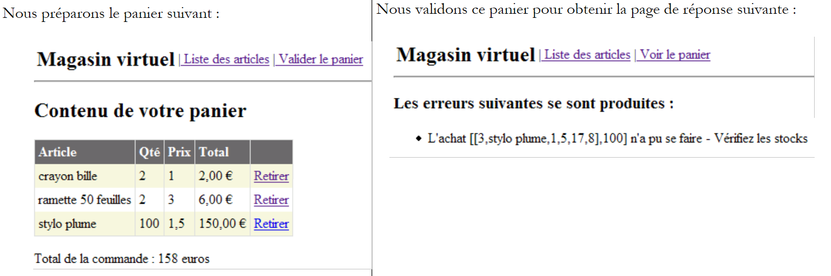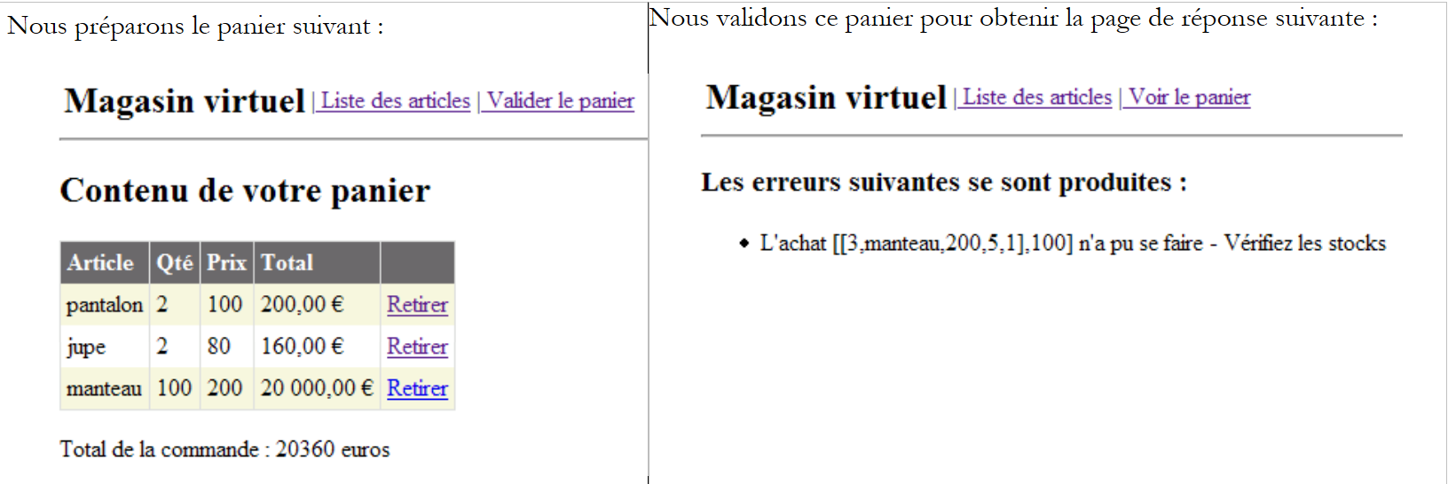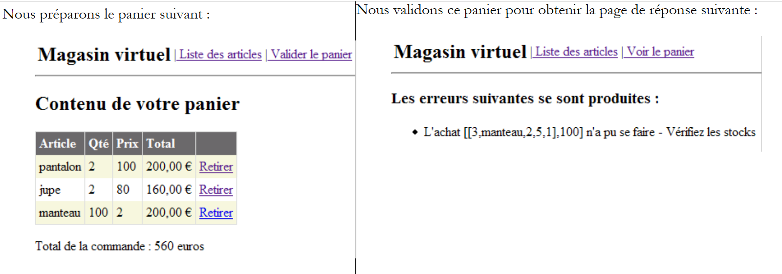 Recall that the [dao] layer is implemented by a class that stores the articles in an [ArrayList] object. This class creates an initial list of four articles. From the view above, we use the menu links to perform operations. Here are a few of them. The left column represents the client’s request, and the right column represents the response sent to the client.