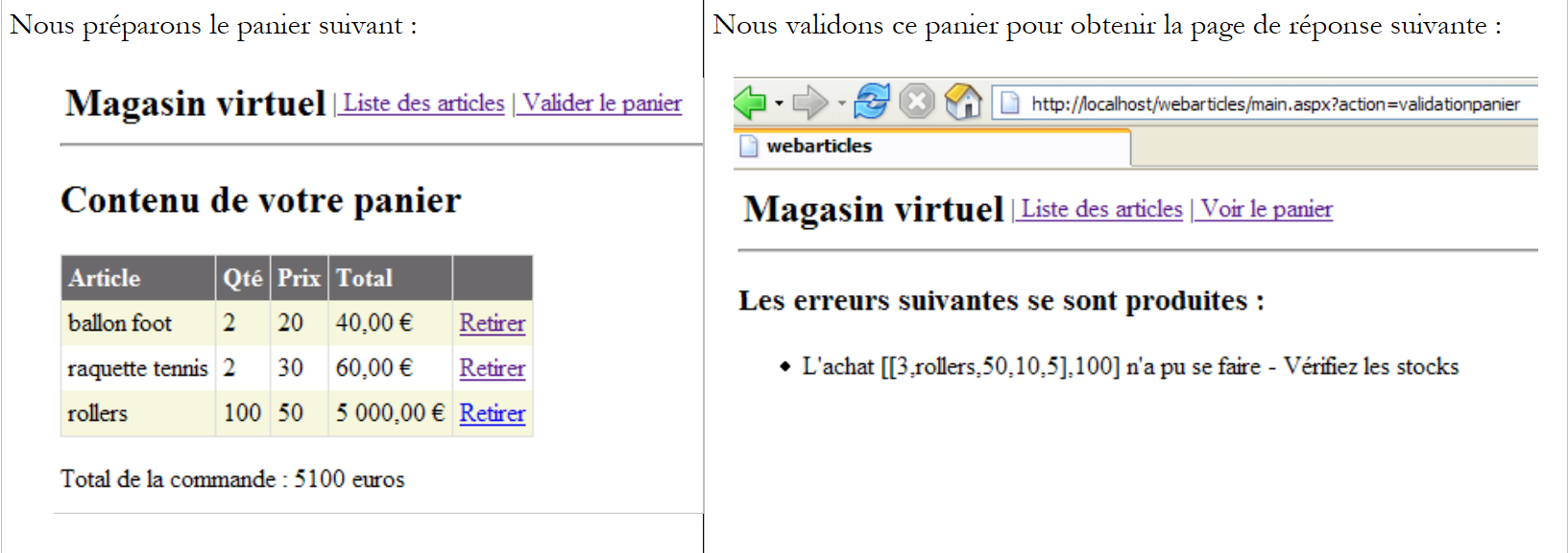 Readers viewing this document on screen will see that some tests passed (green) but others failed (red). The tests that failed are [testArticleAbsent] and [testChangerStockArticle]. After extensive investigation, it appears that the causes of these failures are as follows:
