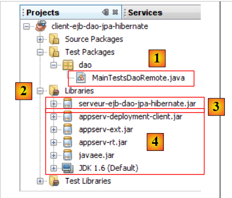 - in [3], the client uses the EJB archive to access the definitions of the [DAO] layer interface and the JPA entities. Note that this archive is located in the [dist] subfolder of the EJB module folder.