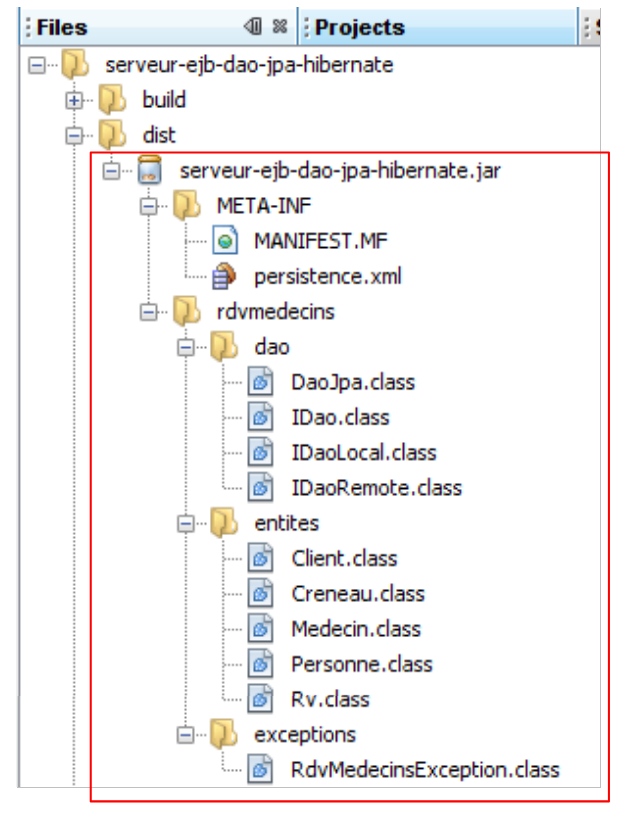 - The [ea-rdvmedecins.ear] archive is located in the [dist] folder [2] of the [Files] tab in NetBeans.