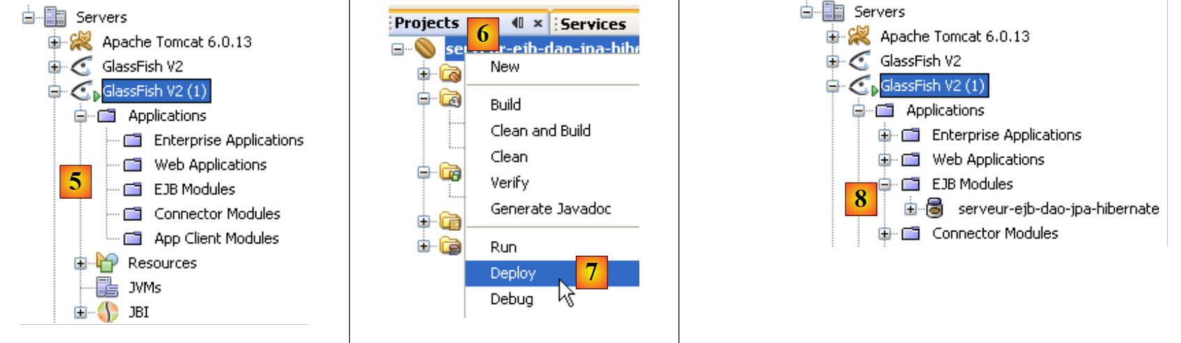 - in [7], the web service [WsDaoJpa] appears in the [Web Services] branch of the GlassFish server. Select it.