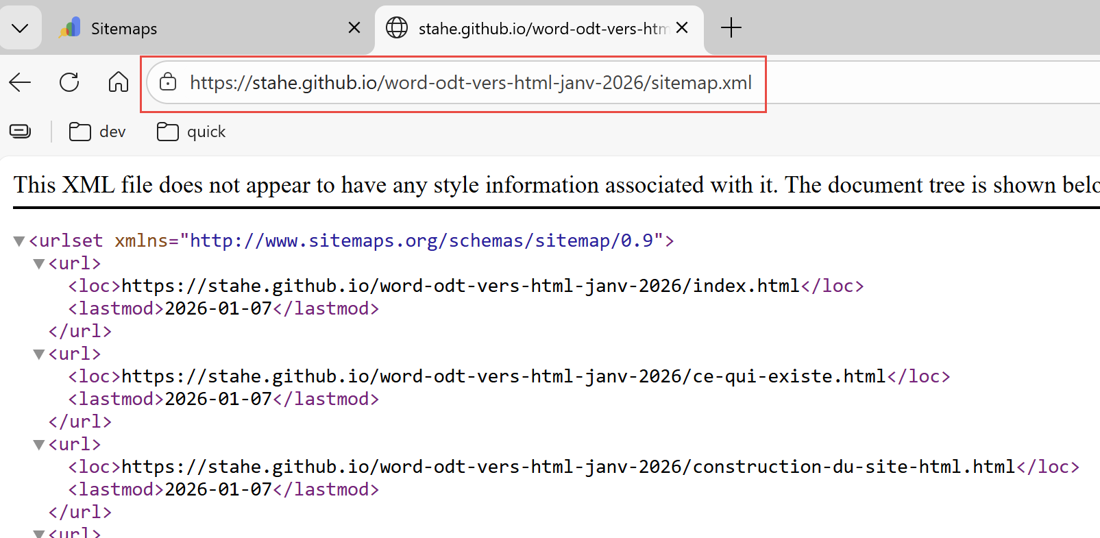 The [sitemap.xml] file is a file that Mkdocs placed in the root directory of the HTML site exported to GitHub. You can verify its presence by typing its URL directly: