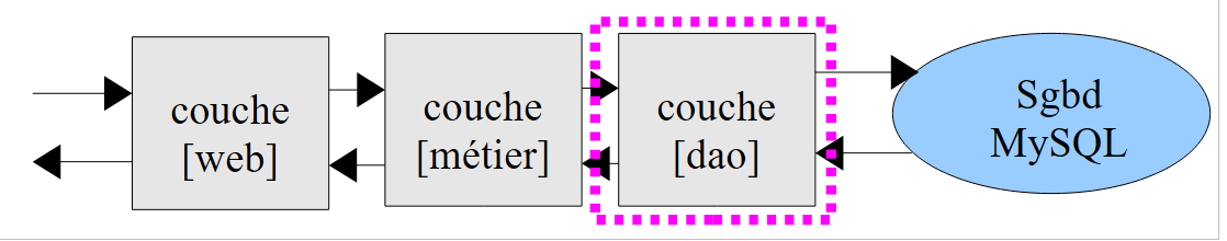 - una capa denominada [DAO] (Objetos de acceso a datos) que se encargará de las interacciones con la base de datos MySQL