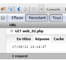 Para ver los intercambios cliente/servidor durante una petición HTTP, introducimos el URL [http://localhost/exemples-web/web_01.php] en el navegador Firefox. A continuación, la ventana de Firebug se llena de información: