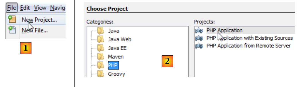 - En [2], seleccionamos la categoría [PHP] y el proyecto [PHP Aplicación