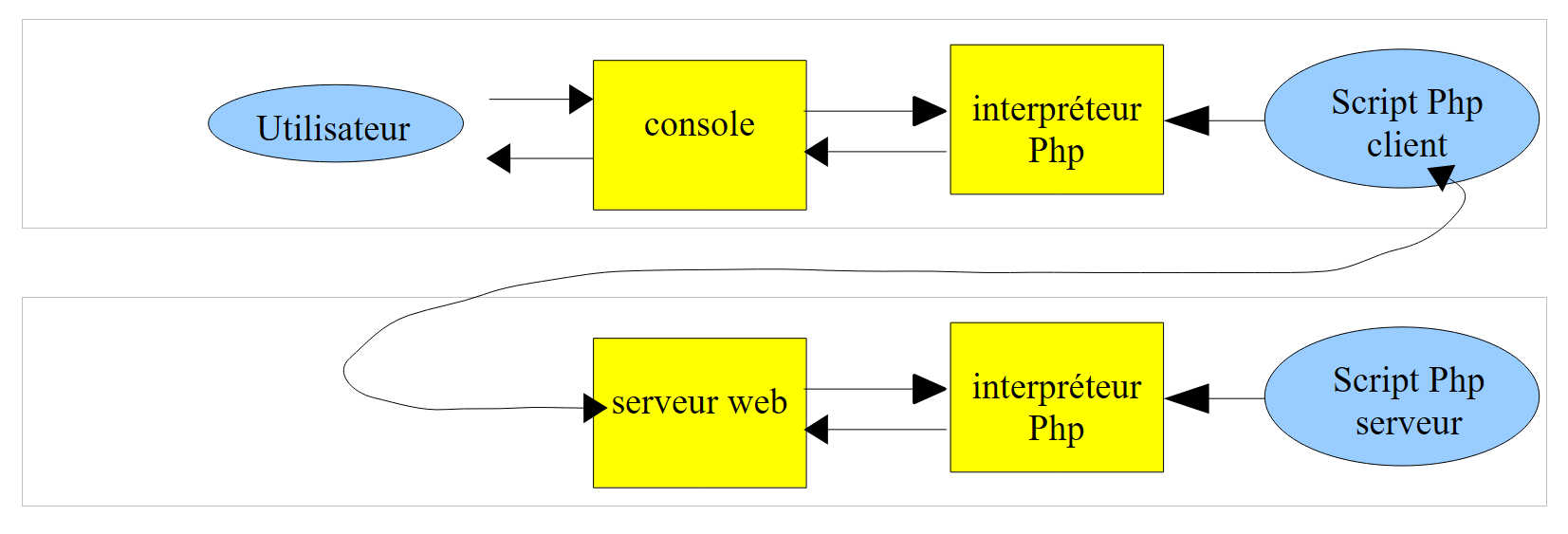 Básicamente, el script PHP anterior muestra la hora actual en la pantalla. Sin embargo, cuando es ejecutado por un servidor web, el flujo 1-que normalmente se asocia con la pantalla-es redirigido a la conexión que une el servidor con su cliente. Por lo tanto, en un contexto web, el script anterior envía la hora actual como texto al cliente.