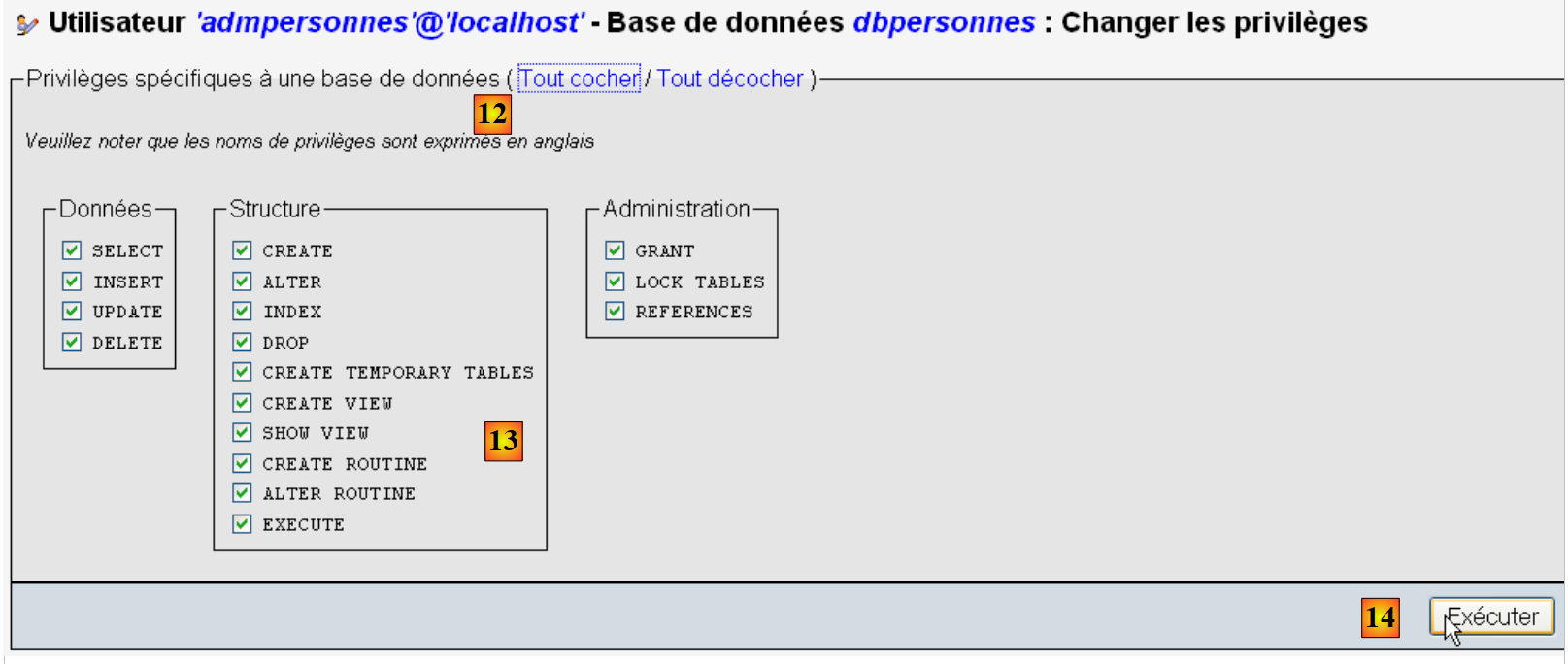 - mediante el enlace [12] [Seleccionar todo], conceda al usuario [admpersonnes] todos los derechos sobre la base de datos [dbpersonnes] [13]