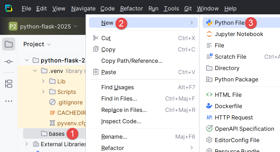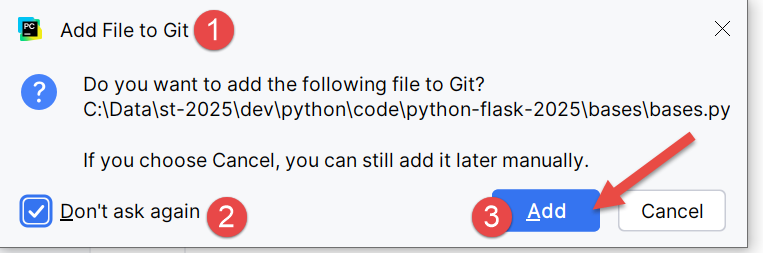 - Recordemos aquí que hemos incluido el gestor de versiones Git en nuestro proyecto. Esto se hizo al crear el proyecto, cuando marcamos la opción Git. Git puede tomar instantáneas del proyecto en diferentes etapas del mismo. Aquí, en [1-3], el IDE nos pregunta si queremos incluir el archivo [bases.py] que estamos creando en la instantánea. Respondemos que sí [3]. Además, marcamos [2] para que esto se haga de forma automática al crear un archivo. Volveremos brevemente sobre Git un poco más adelante;